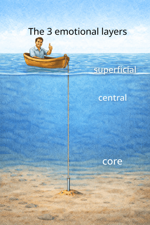 In an earlier post, I explained how emotion is structured into three layers—the superficial, central, and core layers, and when we get torn up emotionally at the central and core layers, that we need to heal to recover from the damage that’s created (03 Neglect and core debilitation). The way this is done is to get hands-on with your emotions instead of staying in your head and thinking about things. The focus of your hands-on work needs to be with the injury itself, not with the story that established or perpetuates your injury.